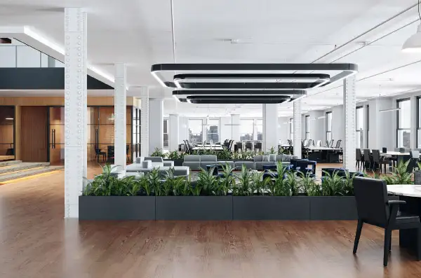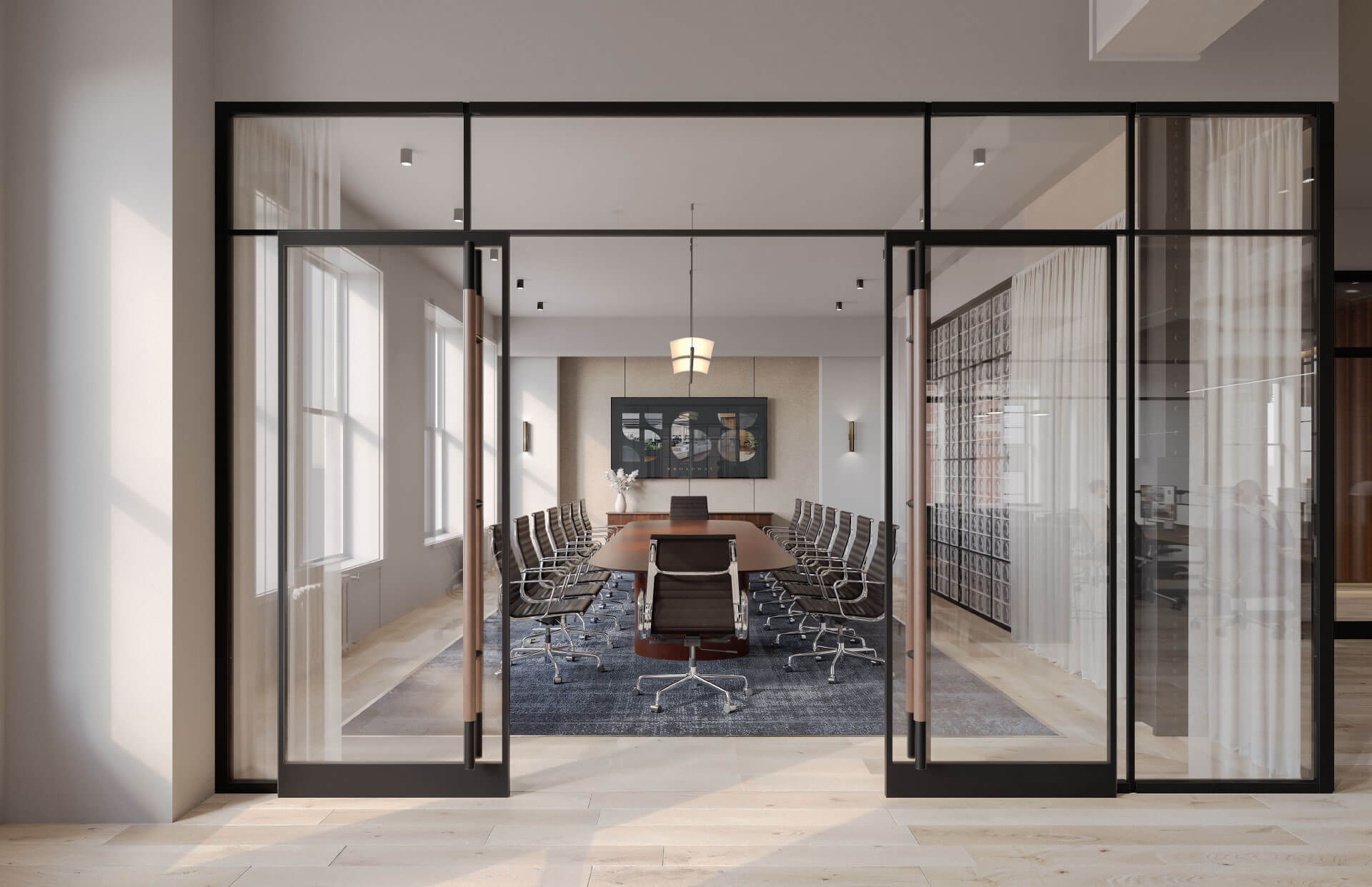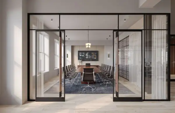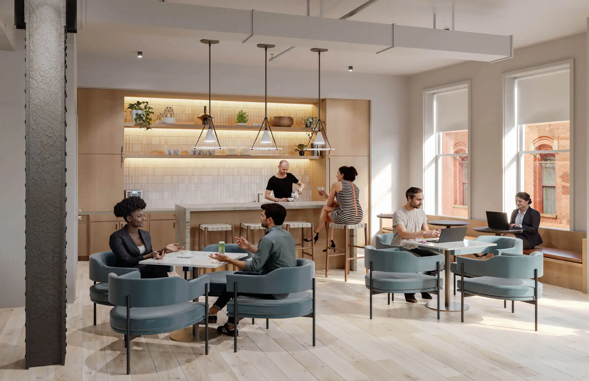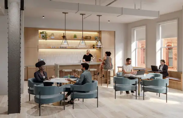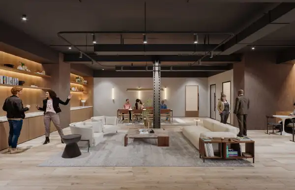 A private amenity space featuring a lounge, coffee bar and conference room